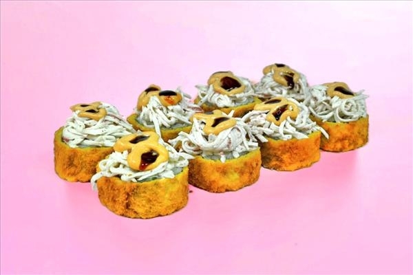Рис, нори, сыр сливочный, курица копченная, огурец, кляр, сухари, сочный краб, соус спайси, соус унаги.