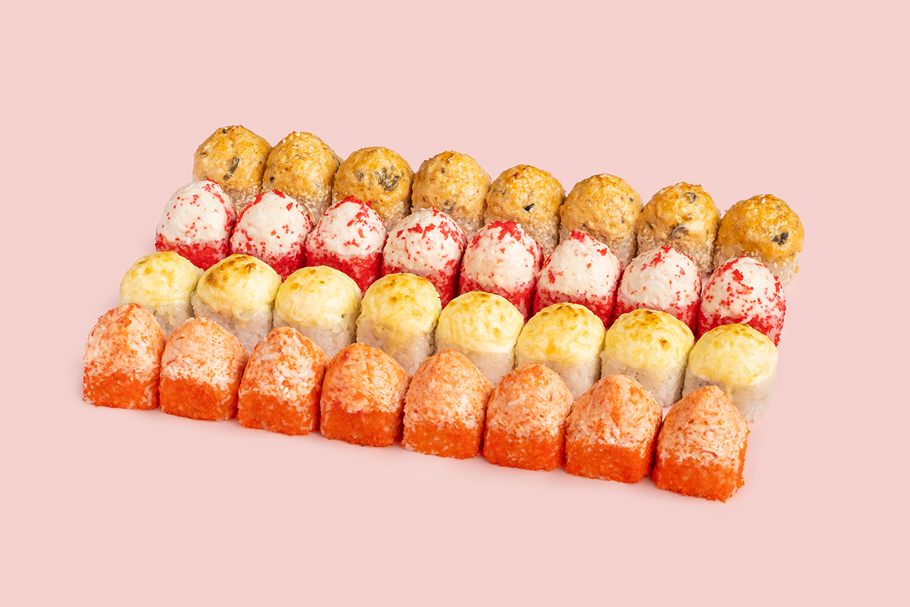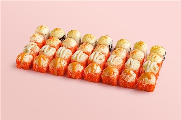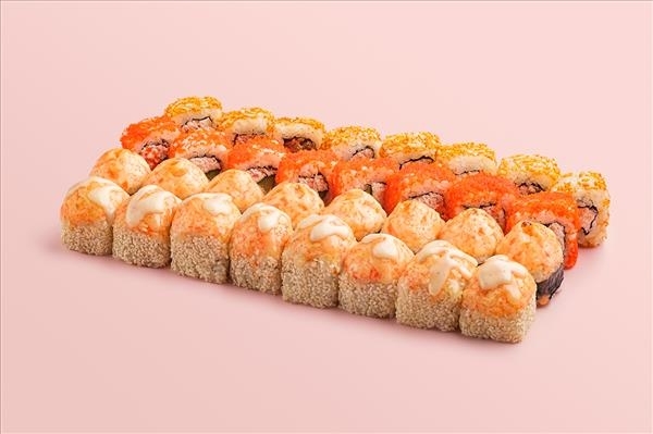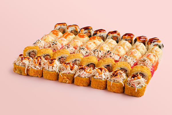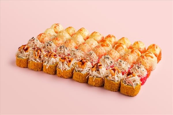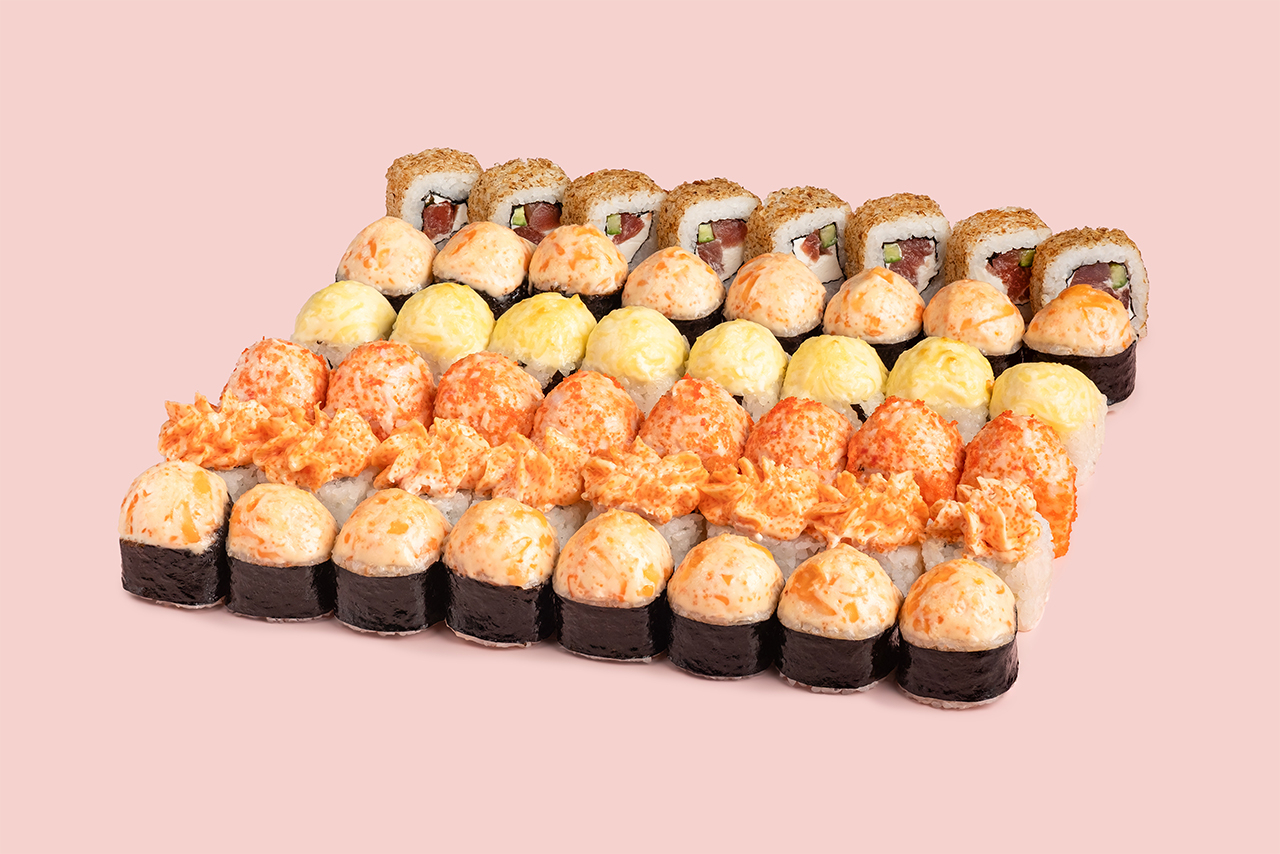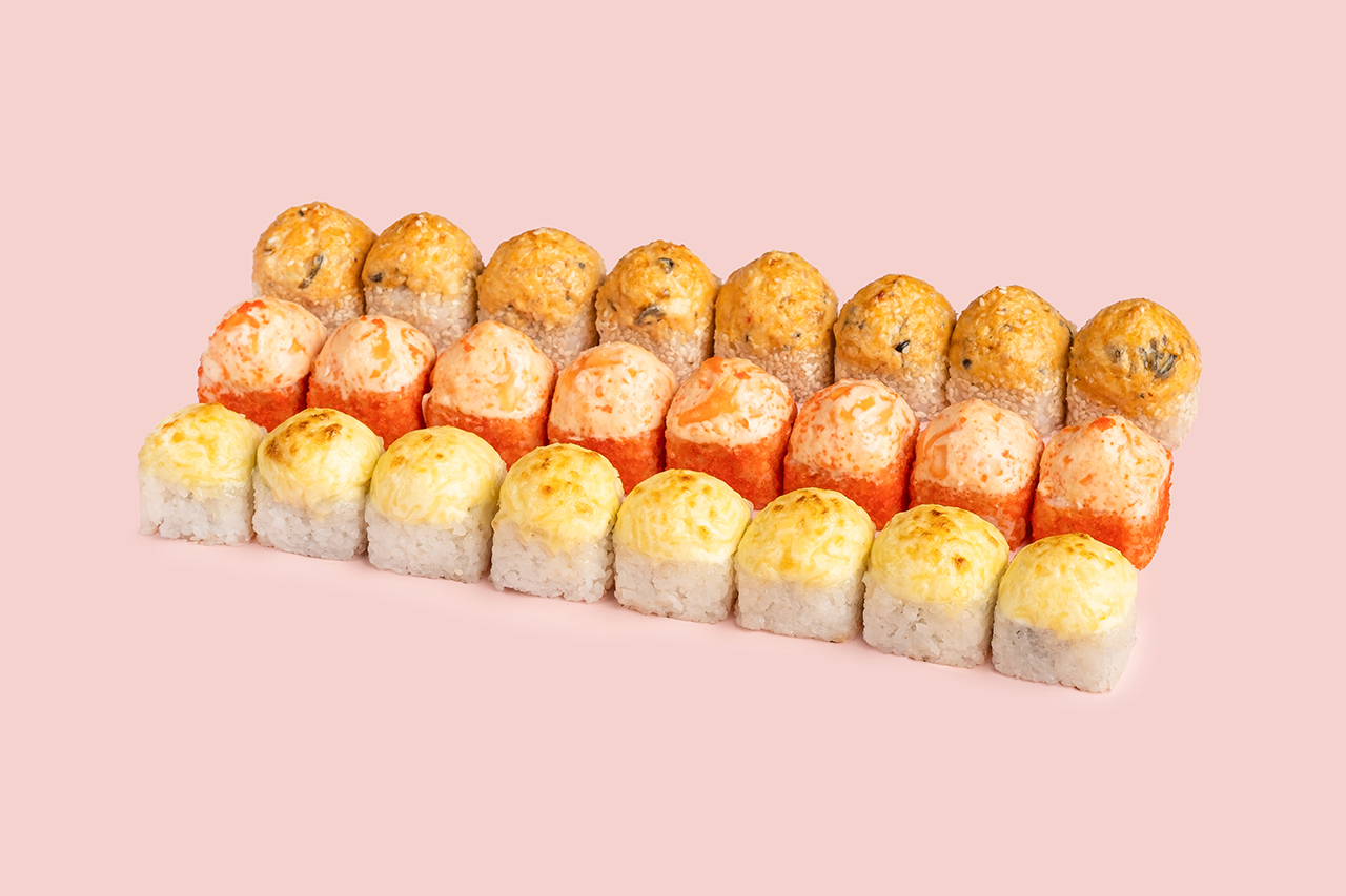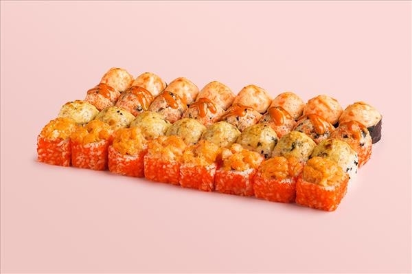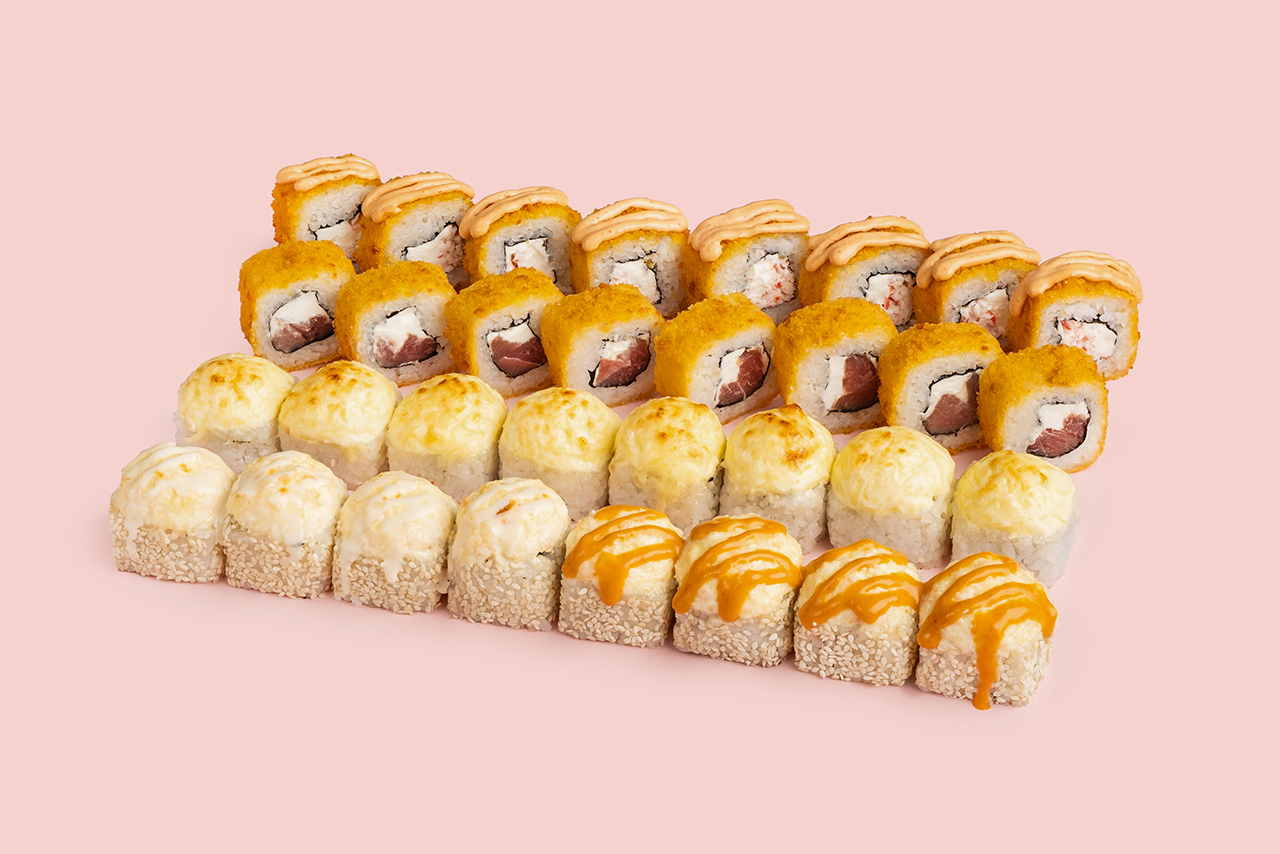 Карибский темпура ролл (8 шт.), Запеченный ролл горячий краб (8 шт.), Лосось Терияки ролл (8 шт.), Запеченный медовый цыпленок (8 шт.),Хот ролл Сочный краб (8 шт.), Запеченный чиз- краб (8 шт.), Ролл нежный краб(8 шт.), Запеченный сливочный (8 шт.), Магуро ролл (8 шт.), Запеченный с креветкой закрытый (8 шт.). Соусы приобретаются отдельно