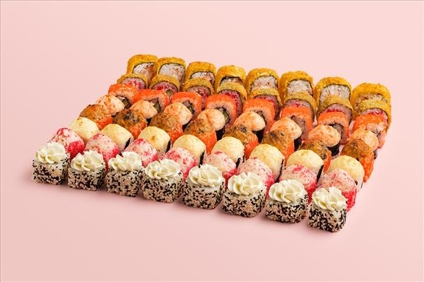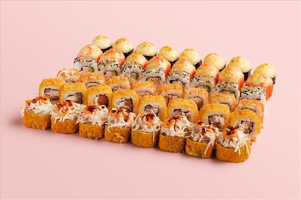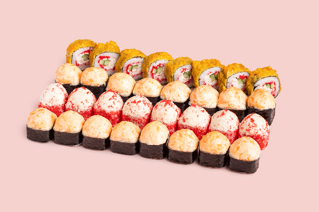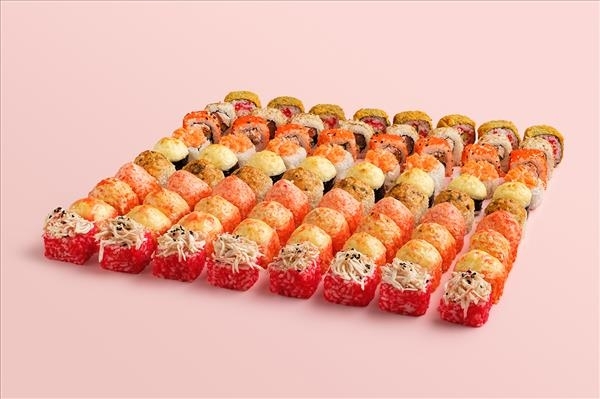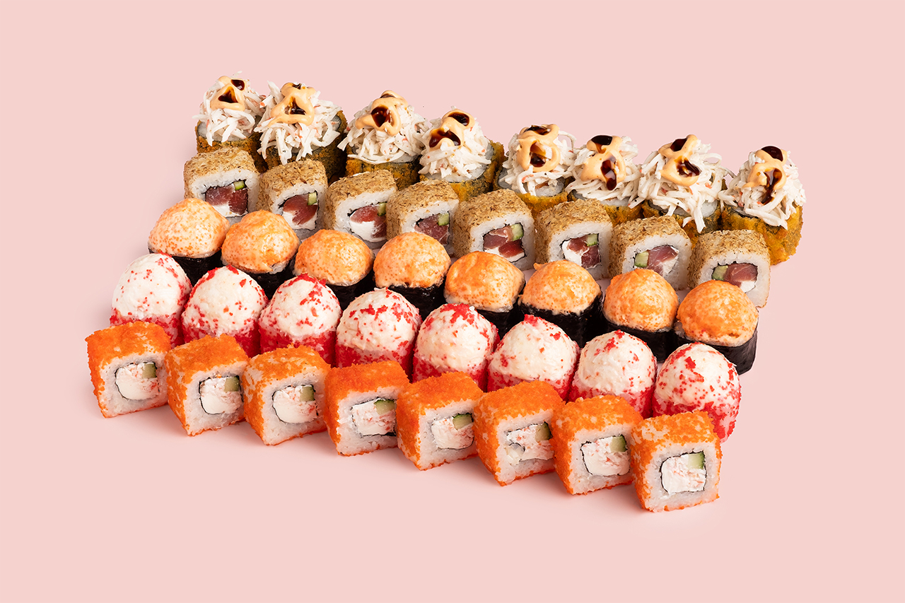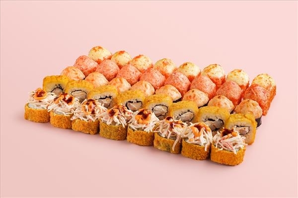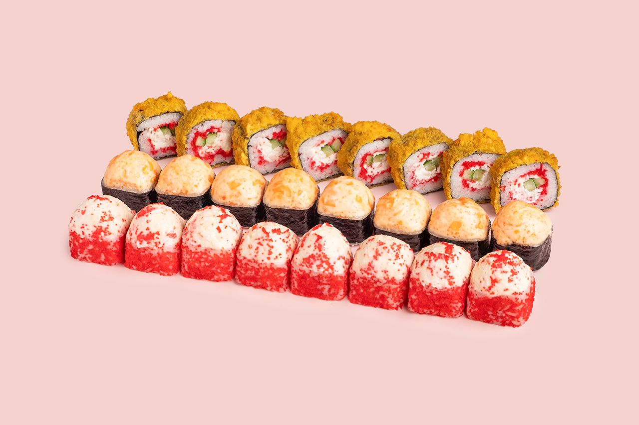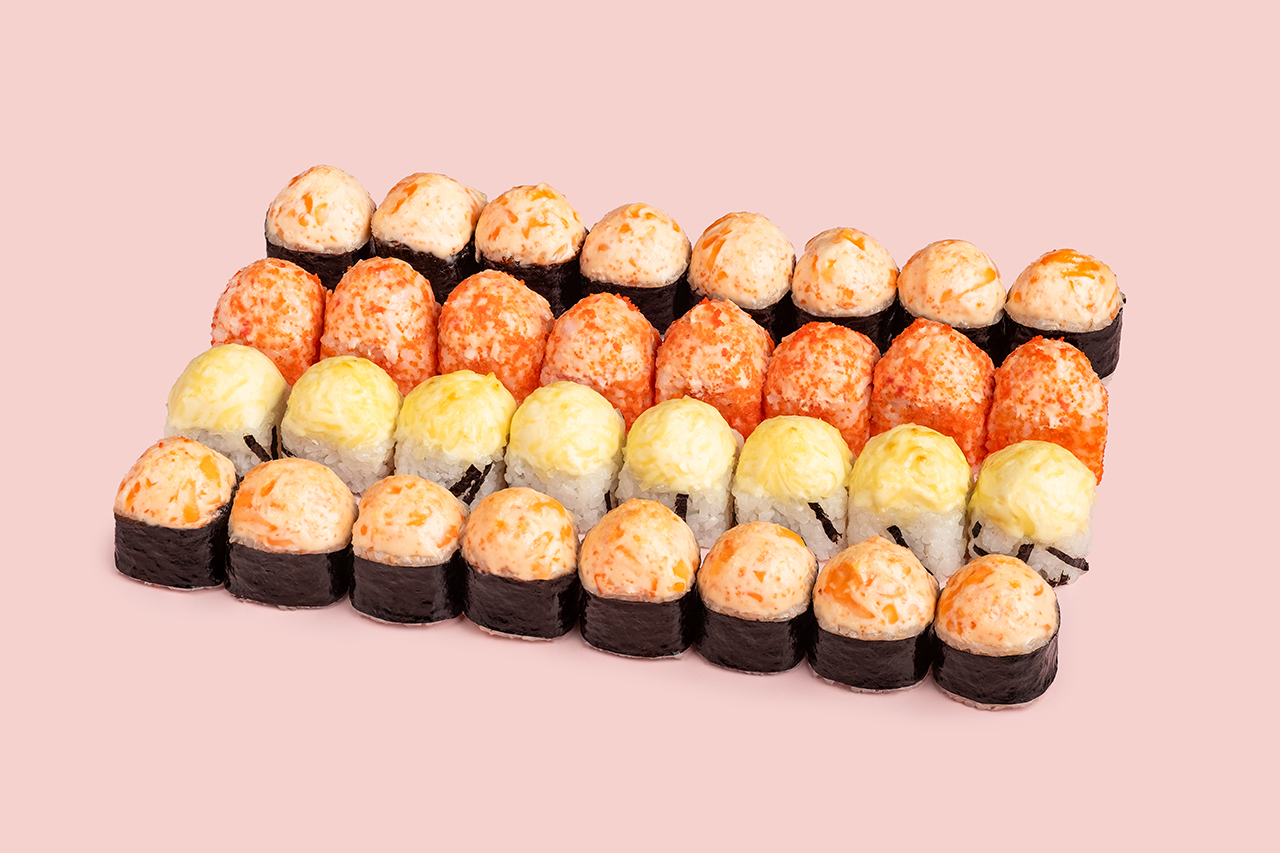 Карибский темпура ролл (8 шт.), Запеченный ролл горячий краб (8 шт.), Лосось Терияки ролл (8 шт.), Запеченный медовый цыпленок (8 шт.),Хот ролл Сочный краб (8 шт.), Запеченный чиз- краб (8 шт.), Ролл нежный краб(8 шт.), Запеченный сливочный (8 шт.), Магуро ролл (8 шт.), Запеченный с креветкой закрытый (8 шт.). Соусы приобретаются отдельно