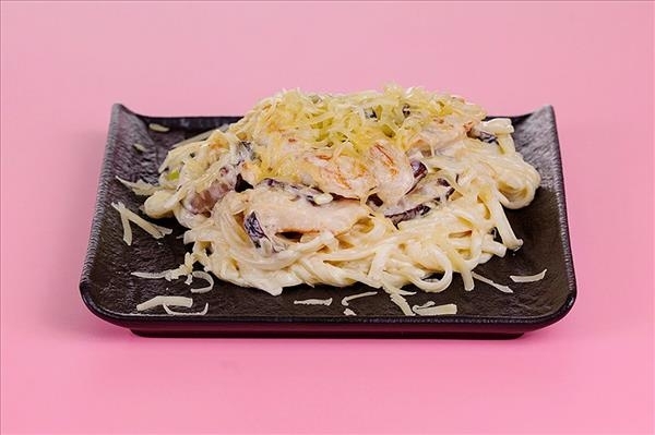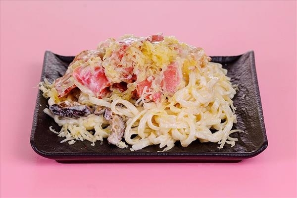 Лапша удон, сливки, бекон, лук репчатый, грибы шиитаке,сыр пармезан, масло растительное