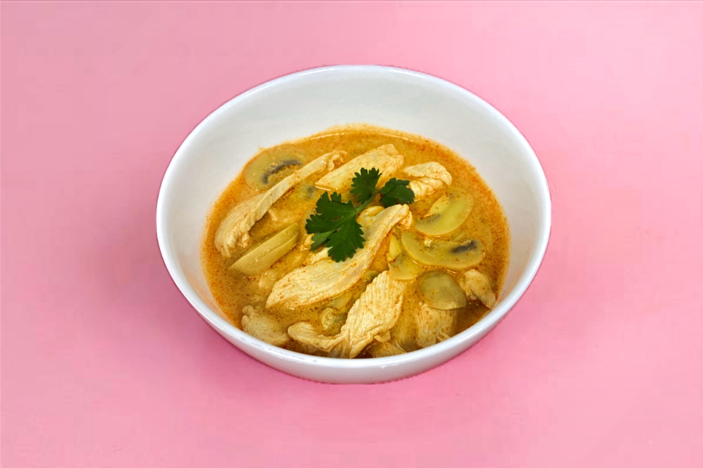 Бульон том ям, рис, куриное филе, грибы шампиньоны, помидоры черри, зелень.