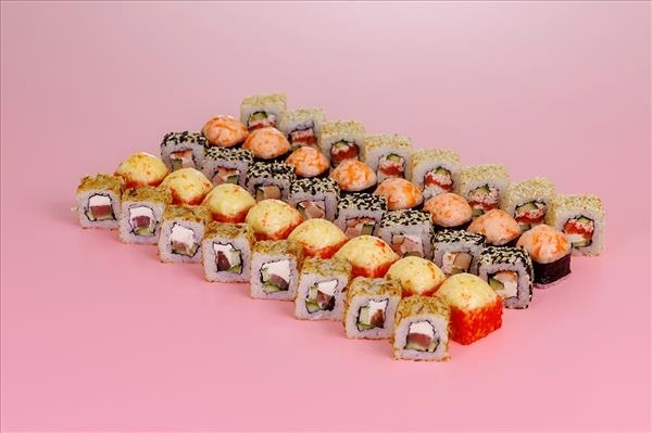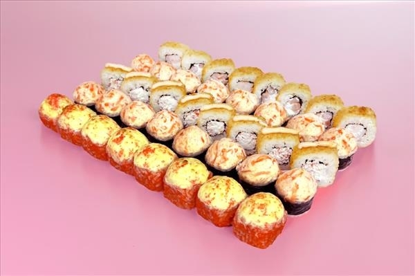 Калифорния с кунжутом (8 шт.), Филадельфия (8 шт.), Лосось Терияки ролл (8 шт.), Маки с тунцом (8 шт.), Овощной ролл (8 шт.), Запеченный Филадельфия (8 шт.), Запеченный с беконом (8 шт.), Запеченный сливочный (8 шт.), Запеченный калифорния с лососем (8 шт.), Запеченный с креветкой закрытый (8 шт.). Соусы приобретаются отдельно