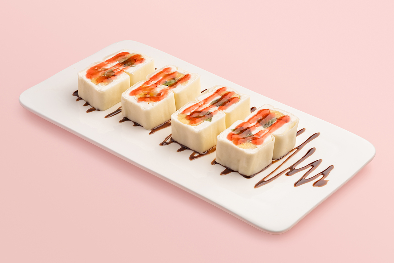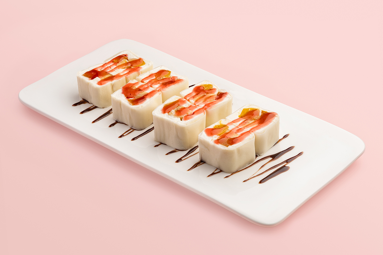 Сливочный сыр, банан, персик, манго,топпинг шоколад, топпинг клубника, сахарная пудра, тесто харумаки