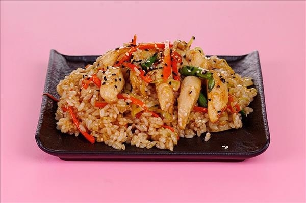 Рис, овощной микс (фасоль стручковая, лук репчатый, морковь, капуста,перец болгарский), куриное филе, соус терияки, масло растительное, кунжут, соус имбирно-чесночный