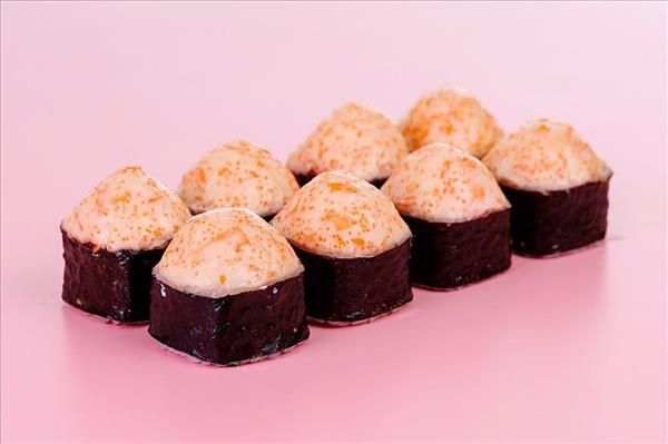 Рис, соус сырный с икрой масаго, курица копченая, лист салата, помидор, нори
