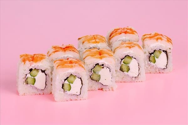 Рис, тигровая креветка, сыр сливочный, огурец, нори