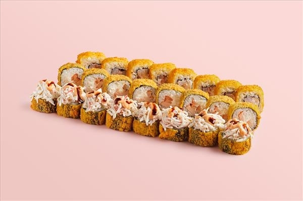 Темпура ролл с креветкой (8 шт.), Темпура ролл с курицей (8 шт.), Темпура Кацу ролл (8 шт.). Соусы приобретаются отдельно