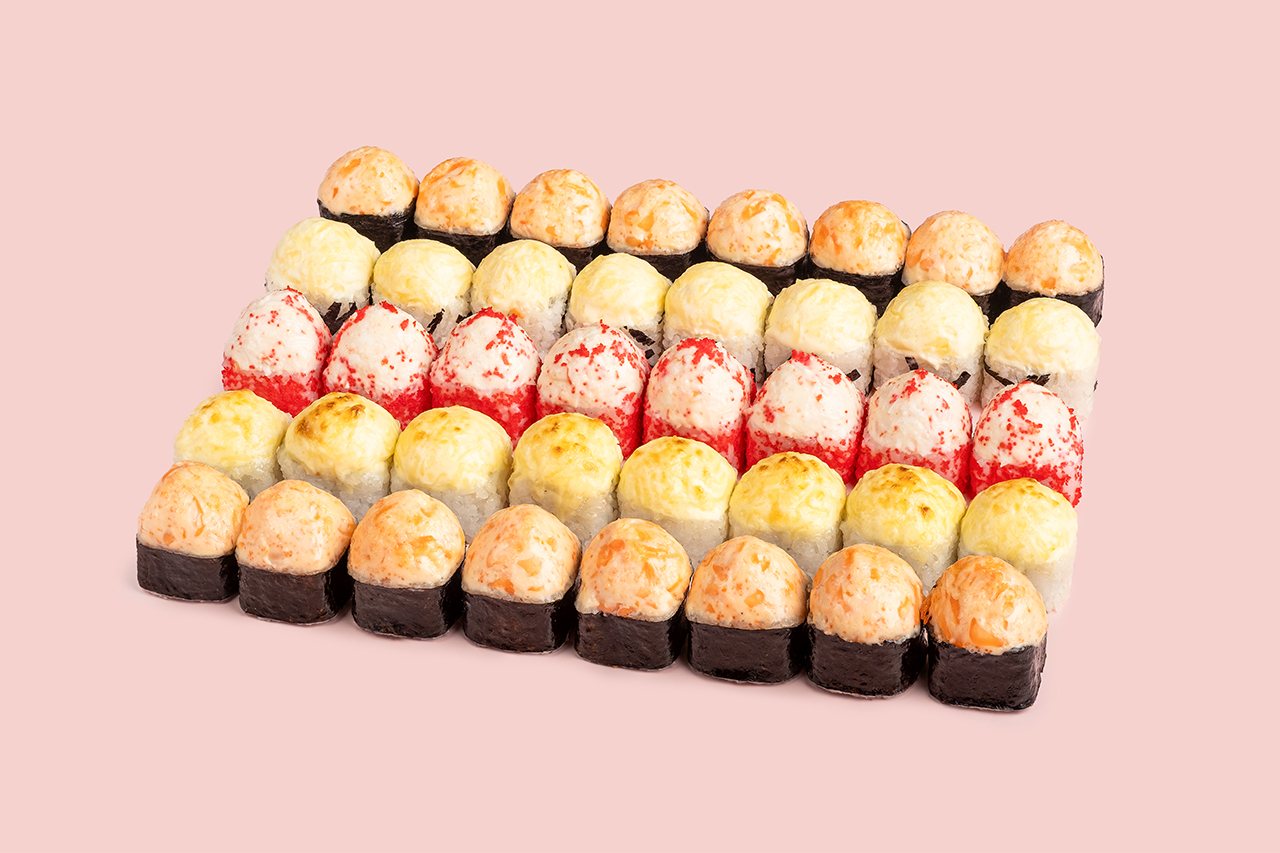 Запеченый ролл Сырный краб (8 шт.), Запеченный ролл с курицей (8 шт.), Запеченный ролл Сырный (8 шт.), Запеченный ролл Сырный Майями (8 шт.), Запеченный ролл с тунцом (8 шт.). Соусы приобретаются отдельно